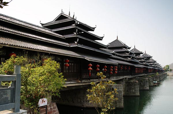 風雨橋:坐落在廣西三江縣的程陽村邊的林溪河上,全橋為石墩木面瓦頂結合而成。橋上建有五座寶塔形狀的樓亭,可避風雨。整座橋無一鐵釘,全用桁槽銜接,它斜穿直套、縱橫交錯,十分精致牢固。坐落在廣西三江林溪河上的程陽橋是風雨橋的代表。因橋上建有廊和亭,既可行人,又可避風雨,故稱風雨橋。這座橋建于1916年,是一座四孔五墩伸臂木梁橋。其結構以橋墩、橋身為主的兩部分。墩底用生松木鋪墊,用油灰沾合料石砌成菱形墩座,上鋪放數層并排巨杉圓木,再鋪木板作橋面,橋面上蓋起瓦頂長廊橋身。橋身為四柱抬樓式建筑,橋頂建造數個高出橋身的瓦頂數層飛檐翅起角樓亭、美麗、壯觀。五個石墩上各筑有寶塔形和宮殿形的橋亭,逶迤交錯,氣勢雄渾。長廊和樓亭的瓦檐頭均有雕刻繪畫,人物、山水、花、獸類色澤鮮艷,栩栩如生,是侗鄉人民智慧的結晶
