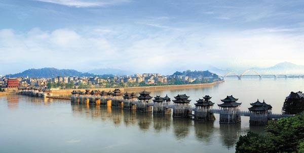 廣濟橋,俗稱湘子橋,宋乾道七年(1171年)太守曾江創建,初為浮橋,由八十六只巨船連結而成始名“康濟橋”。 淳熙元年間(1174年)浮橋被洪水沖垮,太守常煒重修之,并創杰閣于西岸,開始了西岸橋墩的建筑,至紹定元年(1194年)歷五十四年間,朱江、王正功、丁允元、孫叔謹等太守相繼增筑,完成了十個橋墩的建造。其中又以淳熙十六年(1189年)太守丁允元建造的規模最大、功績最著而改稱西橋為“丁公橋”。該橋是現存較早的開關活動式大石橋。