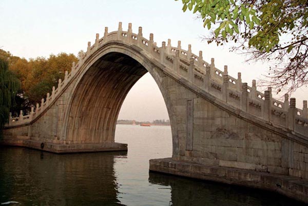 玉帶橋:玉帶橋位于北京頤和園昆明湖長堤上,建于清乾隆年間(公元1736-1795年)。該橋單孔凈跨11.38米,矢高約7.5米,全部用玉石琢成,橋面是雙反向曲線,組成波形線橋型,配有精制白石欄板,顯得格外富麗堂皇。此橋位于北京頤和園內,全橋用漢白玉石建成,拱圈為蛋形,兩側雕刻精美的欄板和望柱,通體潔白、線條流暢。遠望猶如一條玉帶點綴在碧波粼粼的昆明湖上,被游客贊為“海上仙島”